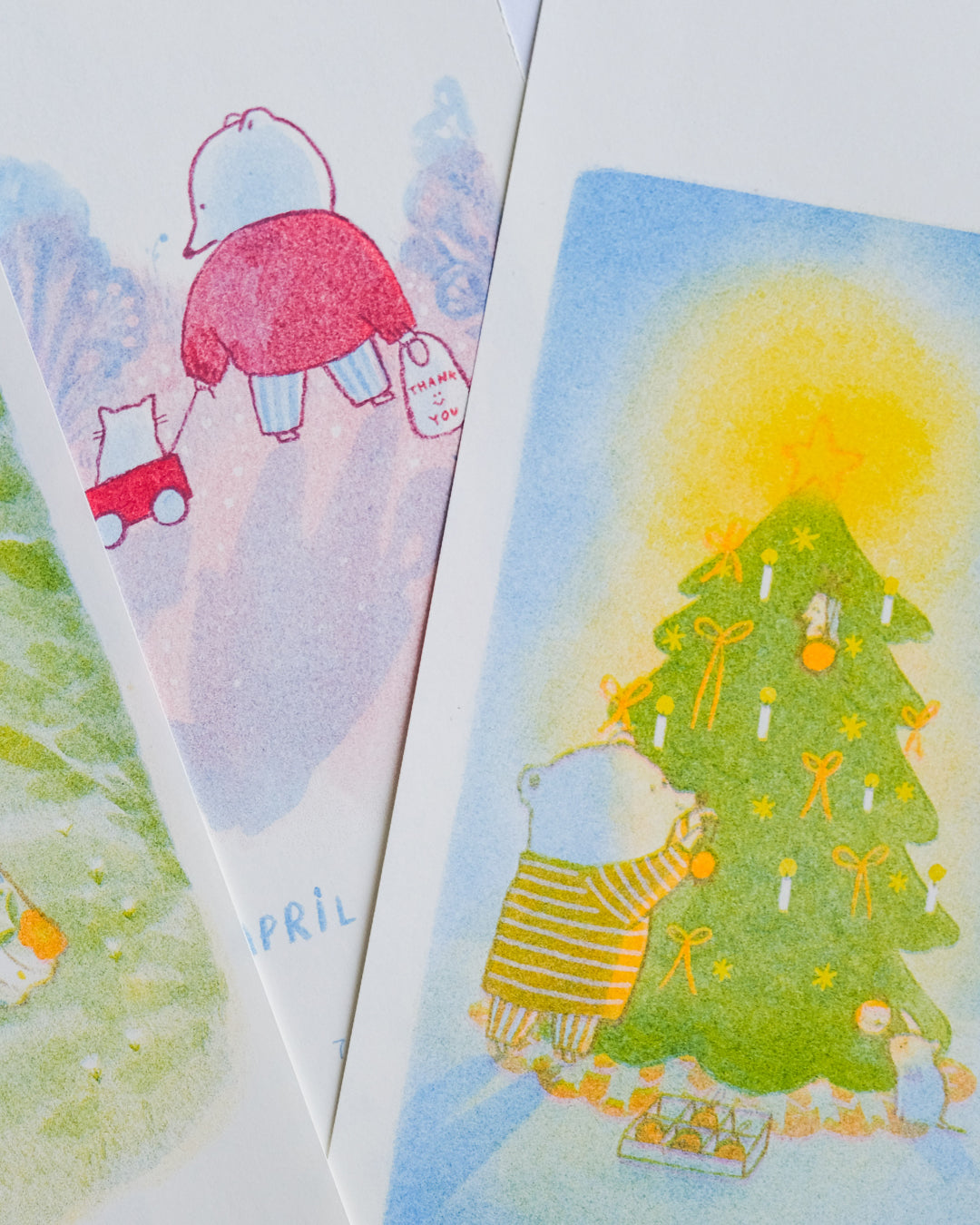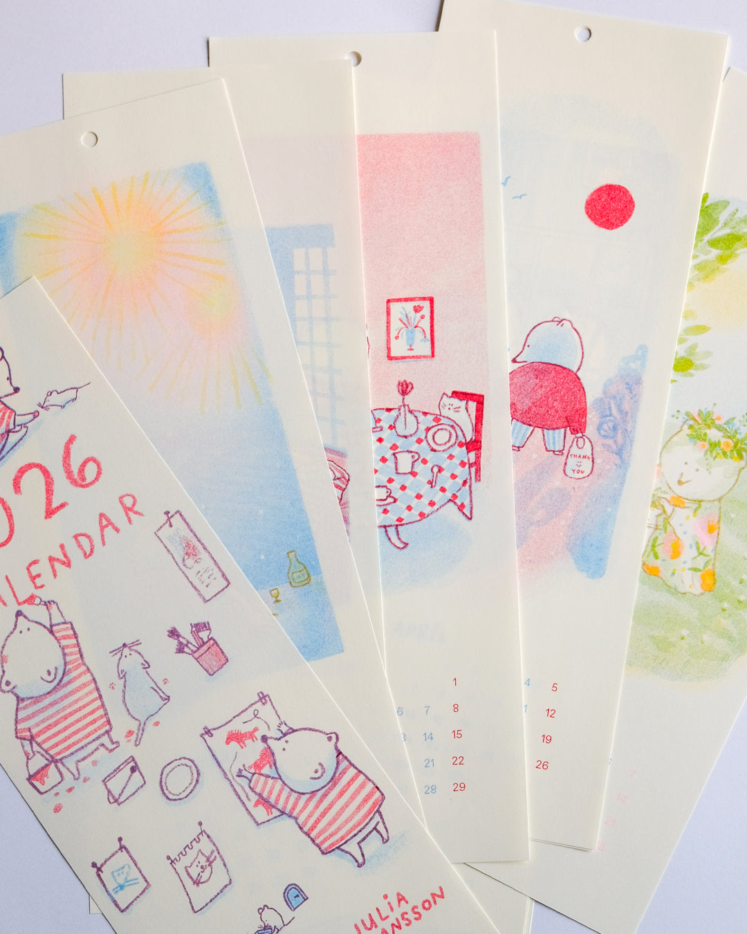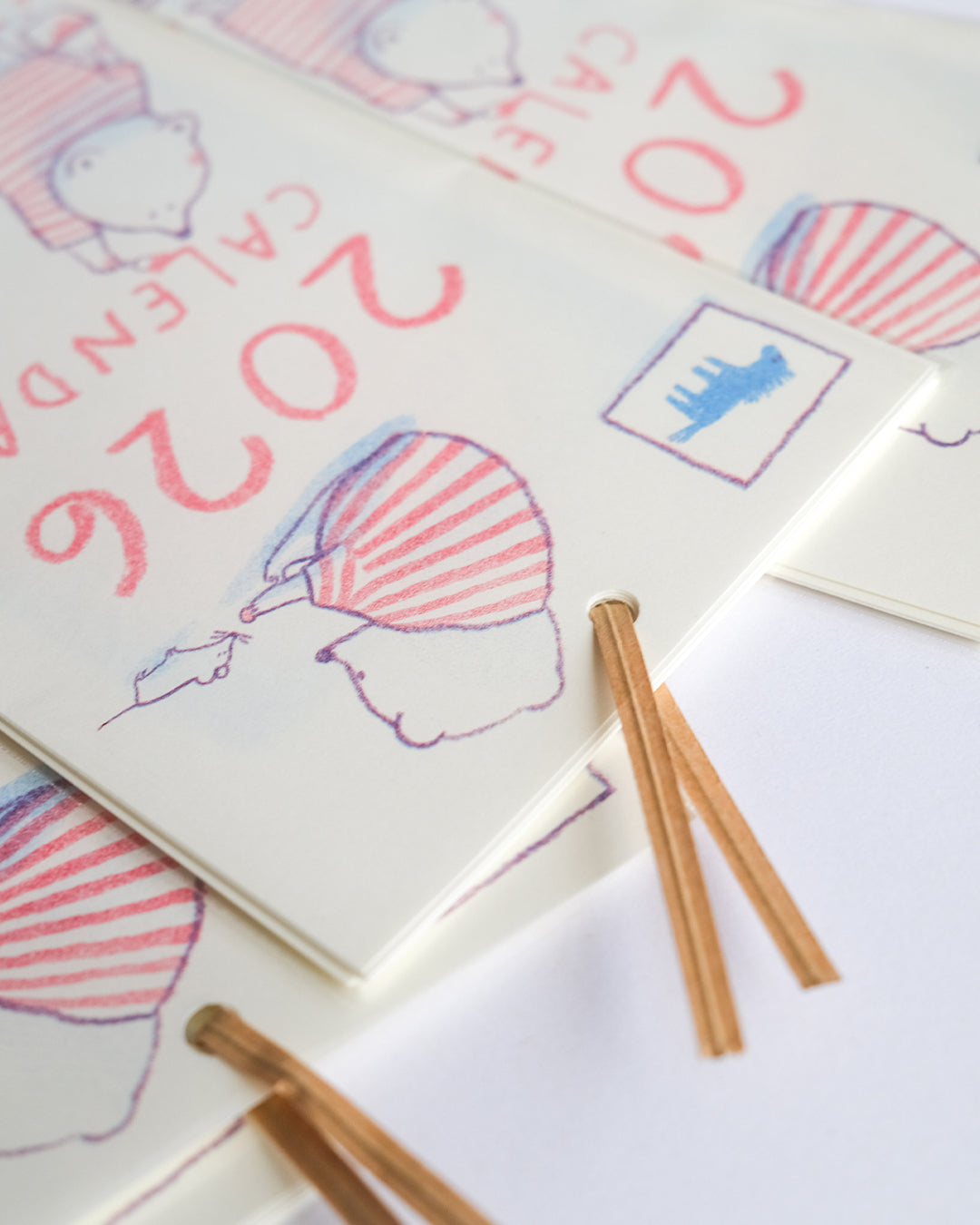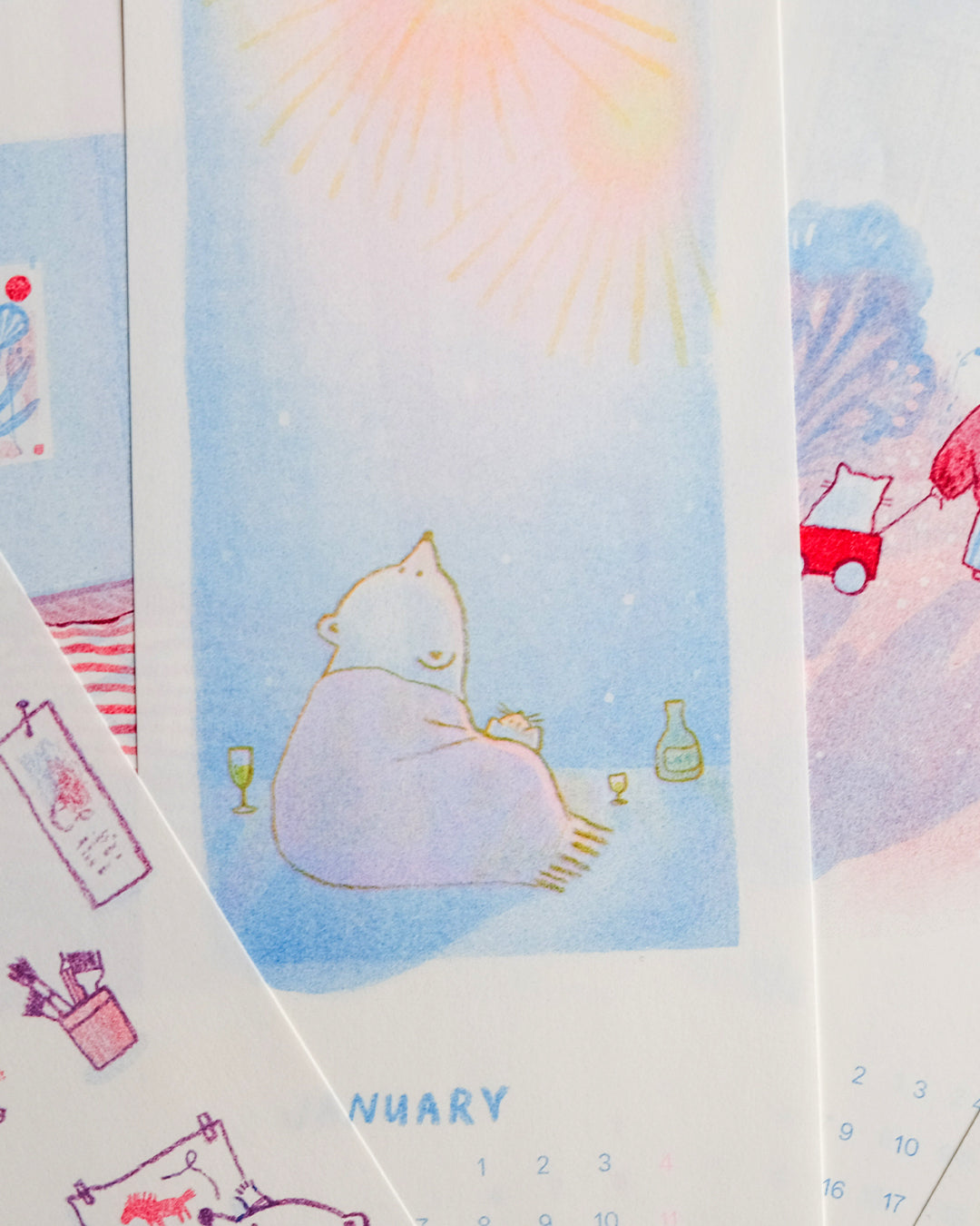 A riso-printed calendar that lets you follow the year of a tiny bear.